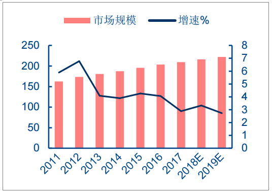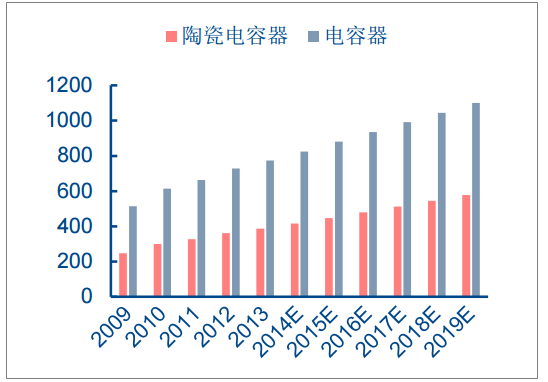 2009-2019年全球陶瓷電容器及電容器市場規(guī)模(單位:億美元)