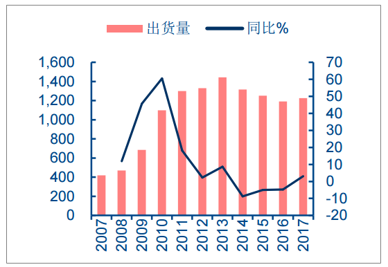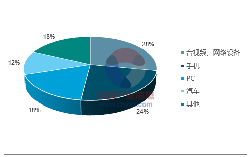 二、存量時代,傳統(tǒng)產(chǎn)業(yè)需求平穩(wěn) 存量時代到來,PC、音像需求穩(wěn)定。消費(fèi)電子是MLCC用量最大的領(lǐng)域,同時也是傳統(tǒng)上最早大量使用MLCC的領(lǐng)域,根據(jù)中國產(chǎn)業(yè)信息網(wǎng)公布的數(shù)據(jù),2016年,手機(jī)、PC和視音頻設(shè)備的MLCC需求分別占到MLCC整體需求的24%、18%和28%,總體占比達(dá)到70%。2013年以前,隨著以智能手機(jī)為代表的消費(fèi)電子產(chǎn)品的普及,消費(fèi)電子的MLCC需求迅速增長。而到2013年之后,消費(fèi)電子進(jìn)入了存量替換時代和產(chǎn)品微創(chuàng)新時代,銷量增速和單機(jī)MLCC用量增速整體均有放緩。到了2017年,智能手機(jī)出貨量增速為-0.3%,PC出貨量增速2%,液晶面板出貨量增速0.23%,均徘徊于零值附近且呈現(xiàn)下降趨勢。總體而言,MLCC的傳統(tǒng)性需求目前增長相對緩慢。而在微創(chuàng)新背景下,PC和音像領(lǐng)域的單機(jī)MLCC需求同樣整體趨穩(wěn),未來幾年,我們預(yù)計PC和音像領(lǐng)域的MLCC需求增速將維持在0值附近。