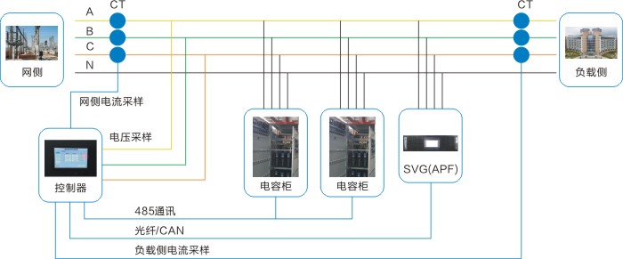 SVGC(APFC)補償系統(tǒng)結合了動態(tài)補償和濾除諧波功能,對于系統(tǒng)中比較穩(wěn)定的無功需量部分可以通過智能電容器進行靜態(tài)補償;對于系統(tǒng)中變化快的無功需量部分可通過SVG(APF)快速補償,對系統(tǒng)諧波進行主動補償,濾除諧波。該系統(tǒng)既可以滿足用戶無功補償的需求,又可以大幅度降低設備成本。